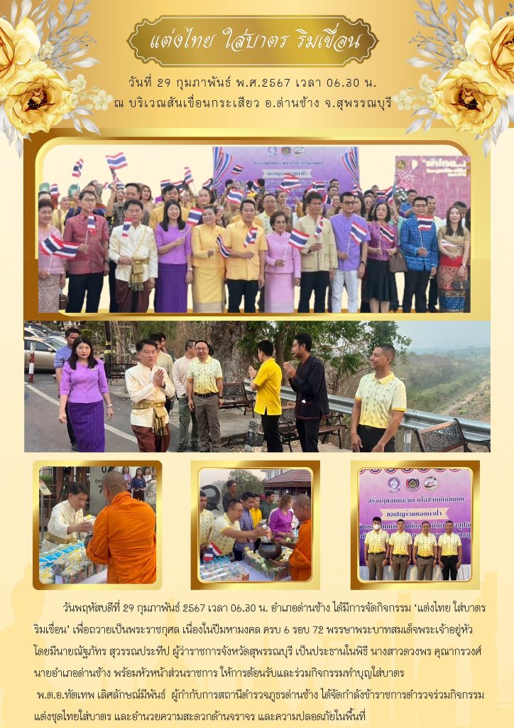 วันพฤหัสบดีที่ 29 กุมภาพันธ์ 2567 เวลา 06.30 น. อำเภอด่านช้าง ได้มีการจัดกิจกรรม ‘แต่งไทย ใส่บาตร ริมเขื่อน’ เพื่อถวายเป็นพระราชกุศล เนื่องในปีมหามงคล ครบ 6 รอบ 72 พรรษาพระบาทสมเด็จพระเจ้าอยู่หัว โดยมีนายณัฐภัทร สุวรรณประทีป ผู้ว่าราชการจังหวัดสุพรรณบุรี เป็นประธานในพิธี นางสาวดวงพร คุณากรวงศ์ นายอำเภอด่านช้าง พร้อมหัวหน้าส่วนราชการ ให้การต้อนรับและร่วมกิจกรรมทำบุญใส่บาตร