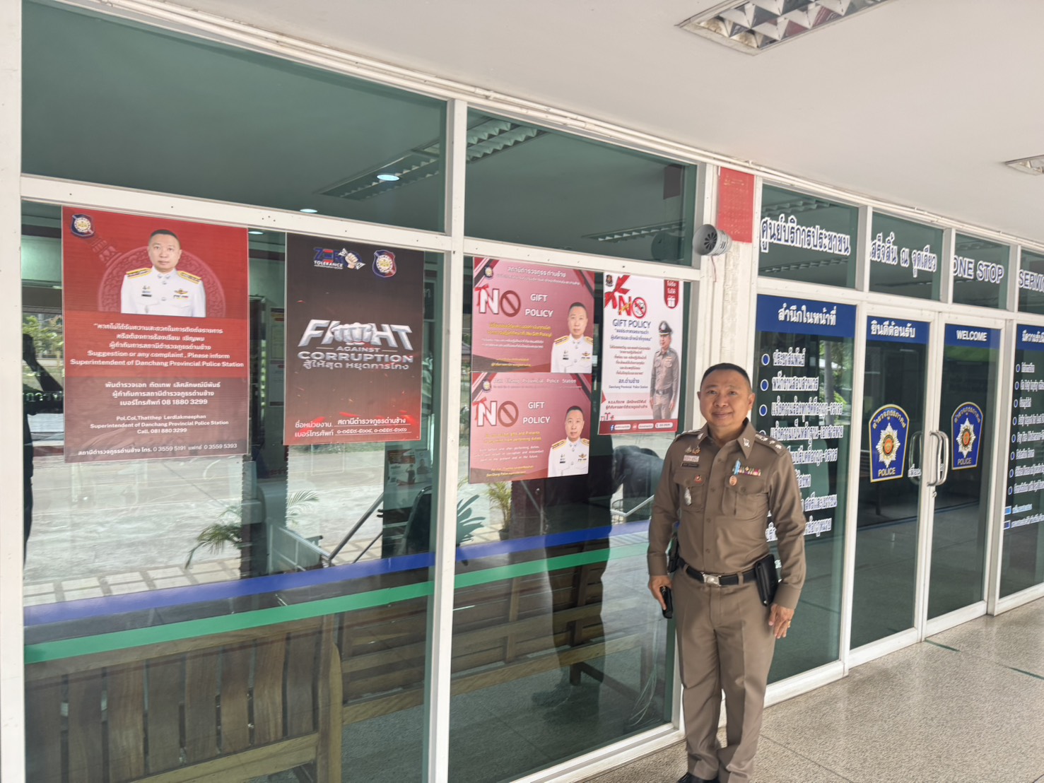 ผู้กำกับการสถานีตำรวจภูธรด่านช้างประชาสัมพันธ์และติดตั้งป้าย No Gift Policy บริเวณจุด ONE STOP SERVICE และตามห้องต่างๆ ภายในสถานีตำรวจ